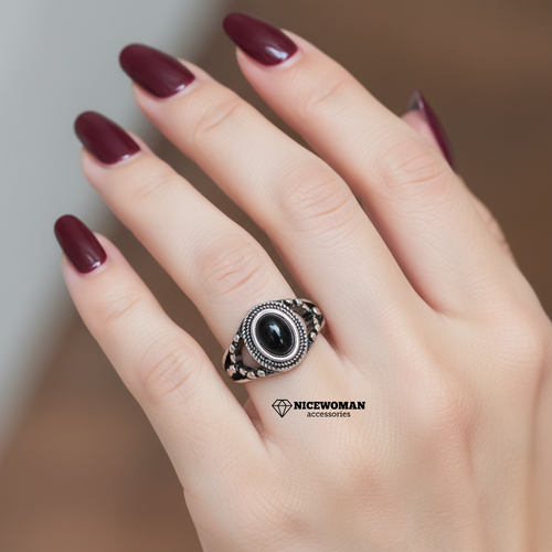 انگشتر نقره ای سیاه قلم طرح دار نگین مشکی برند اروپایی ضدحساسیت