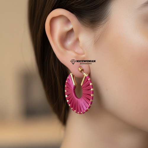 گوشواره زنانه میخی نیم حلقه طلایی مکرومه صورتی برند اروپایی ضدحساسیت
