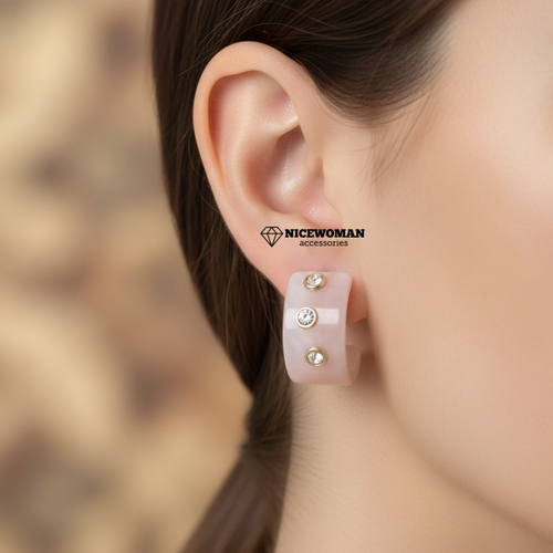 گوشواره زنانه میخی نیم حلقه کرمی گلبهی نگین دار برند اروپایی ضدحساسیت