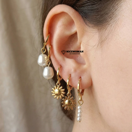 پک گوشواره طلایی آویز قفلی و آویز سه جفتی مروارید و خورشید برند اروپایی ضدحساسیت