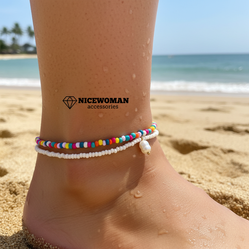 پابند زنانه دو ردیف آویز مروارید و مهره رنگی برند اروپایی ضدحساسیت