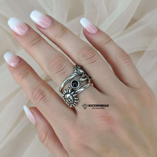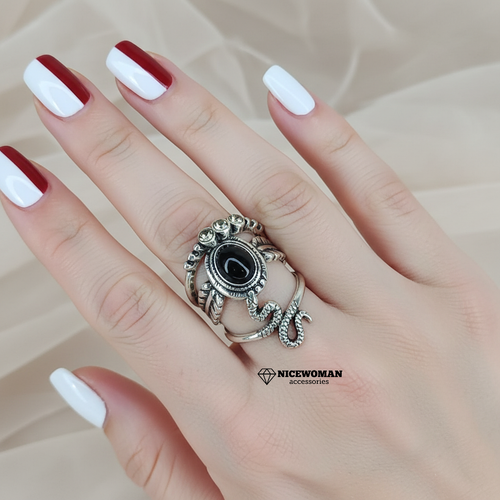 پک انگشتر نقره ای سیاه قلم مار و سنگ مشکی و نگین برند اروپایی ضدحساسیت