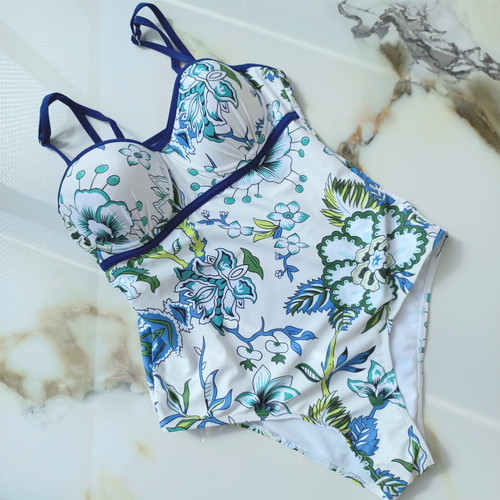 مایو زنانه کاپ دار فنردار سفید طرح سبز آبی برند اروپایی ضد کلر