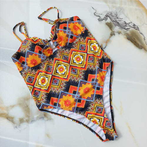 مایو زنانه پد دار بدون فنر مشکی نارنجی طرح دار برند اروپایی ضد کلر