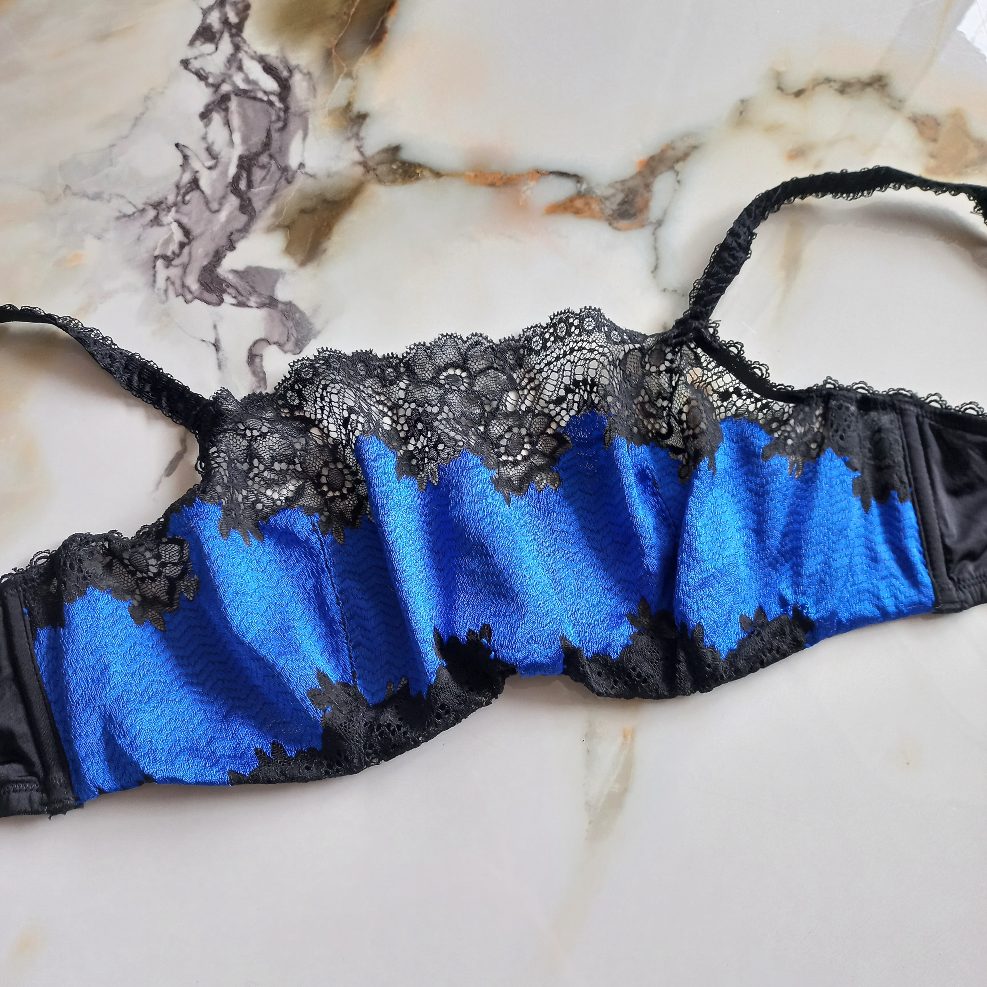 سوتین زنانه فنردار توری آبی مشکی برند اروپایی etam