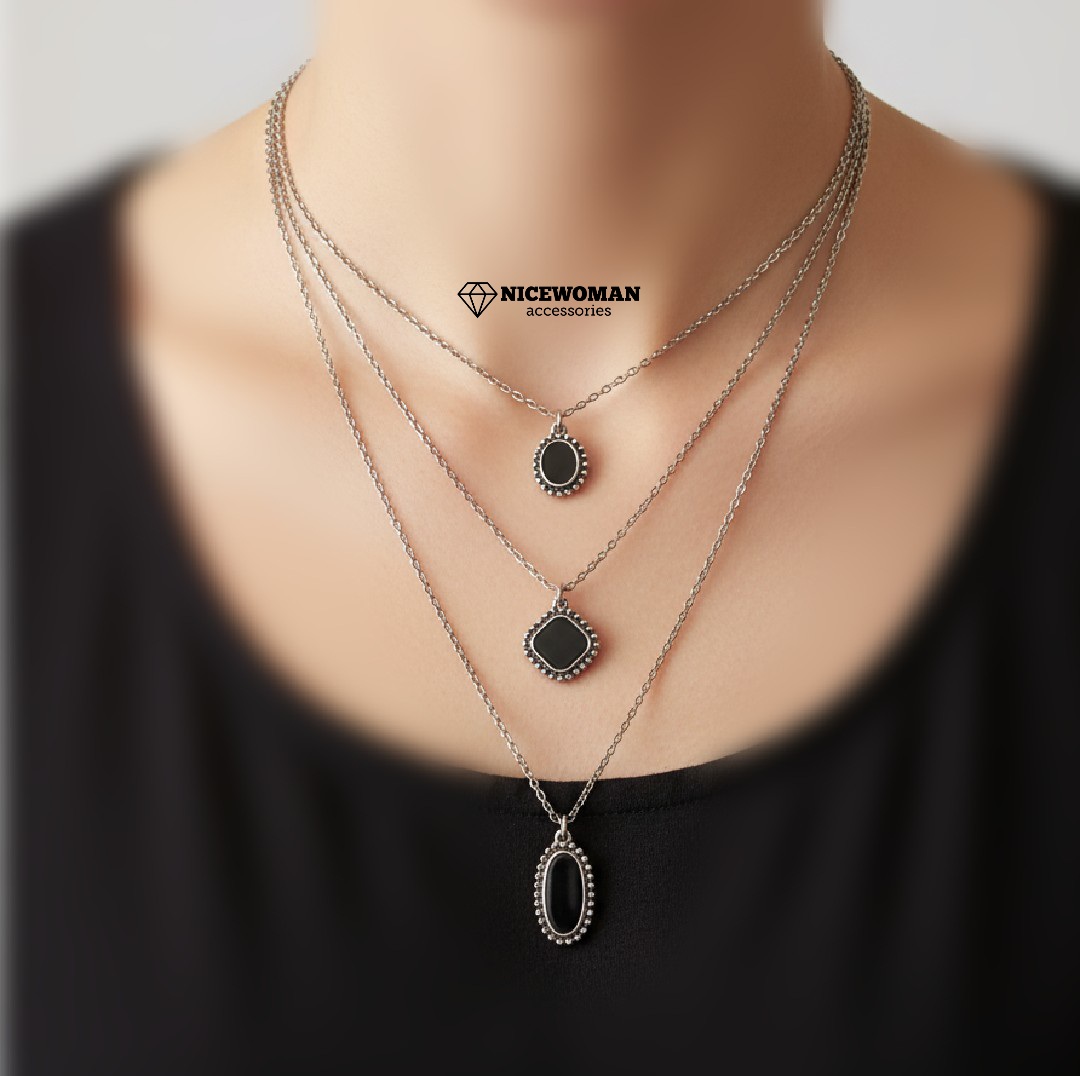ناموجودگردنبند زنانه سه ردیف آویز مشکی برند اروپایی accessories ضدحساسیت