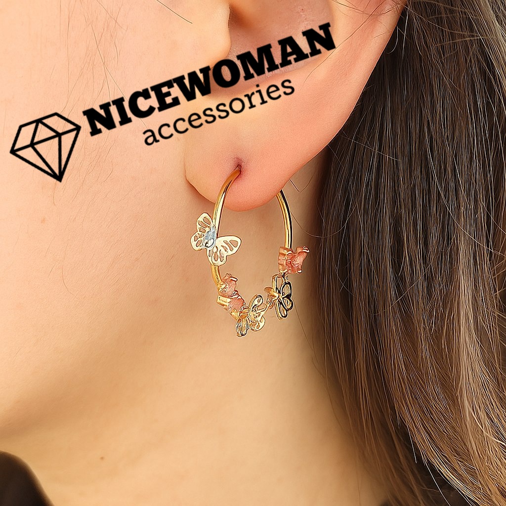 ناموجودگوشواره زنانه حلقه ای طلایی گل و پروانه نگین دار برند اروپایی Iam ضدحساسیت