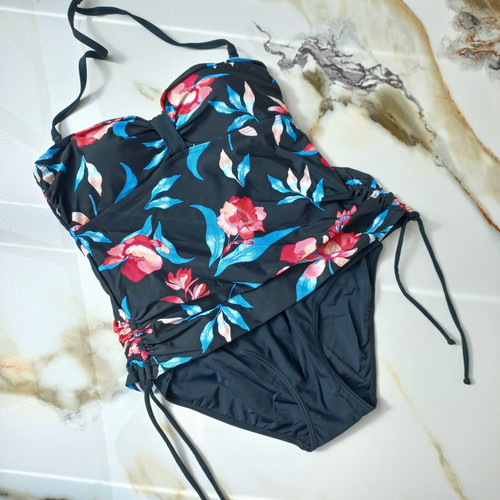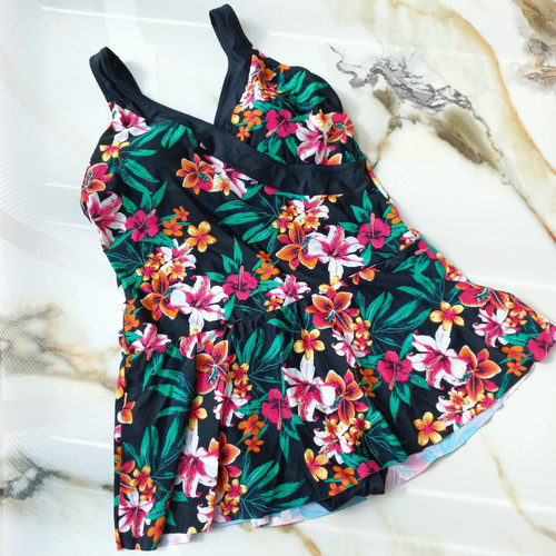 مایو زنانه دامن شورتکی کاپ دار بدون فنر مشکی طرح گل برند اروپایی تی یو ضد کلر