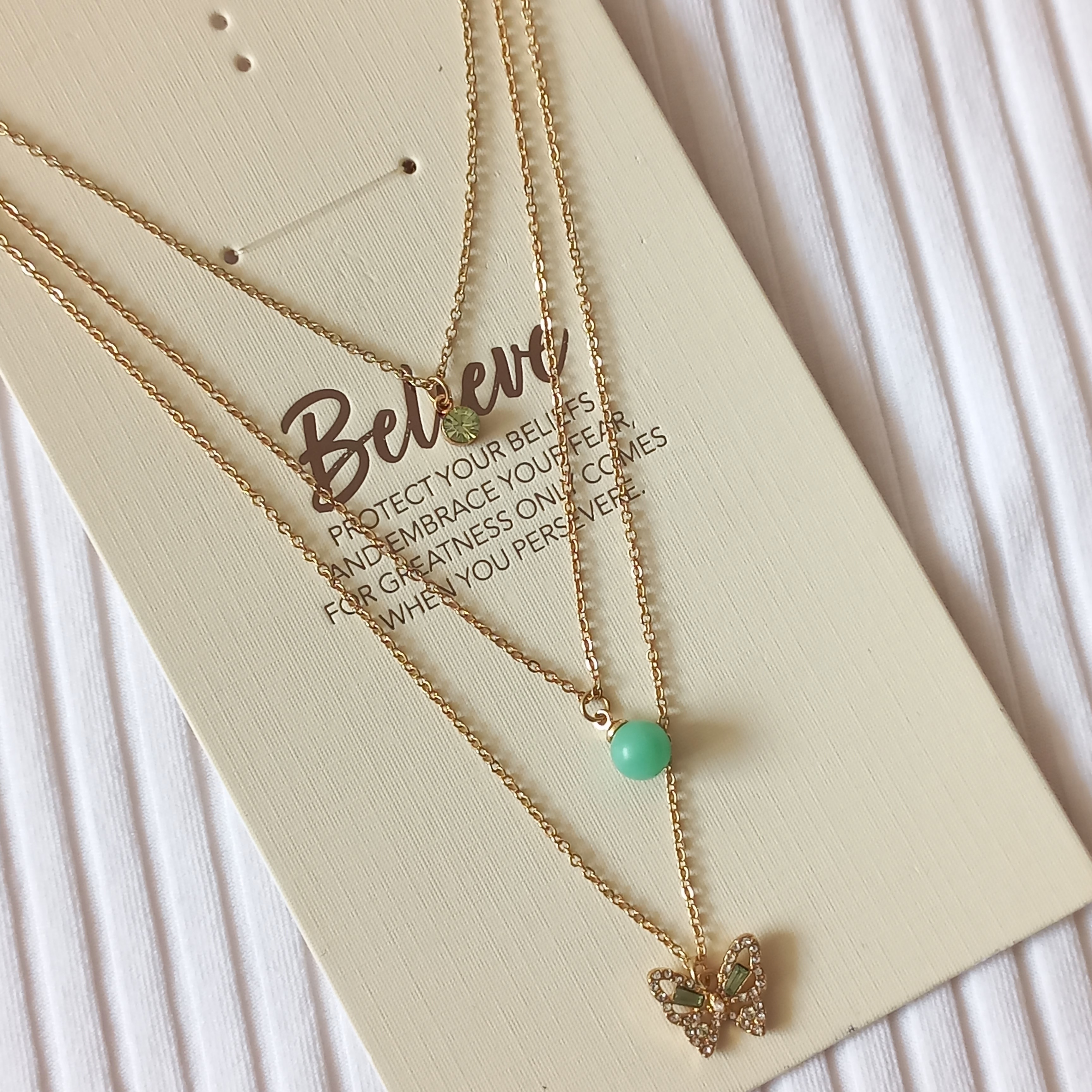 ناموجودگردنبند زنانه سه ردیف آویز سنگ پروانه نگین سبز برند اروپایی Iam ضدحساسیت