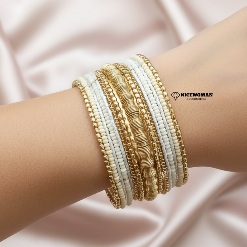 ناموجوددستبند زنانه مهره سفید طلایی هندی فنری برند اروپایی accessories ضدحساسیت