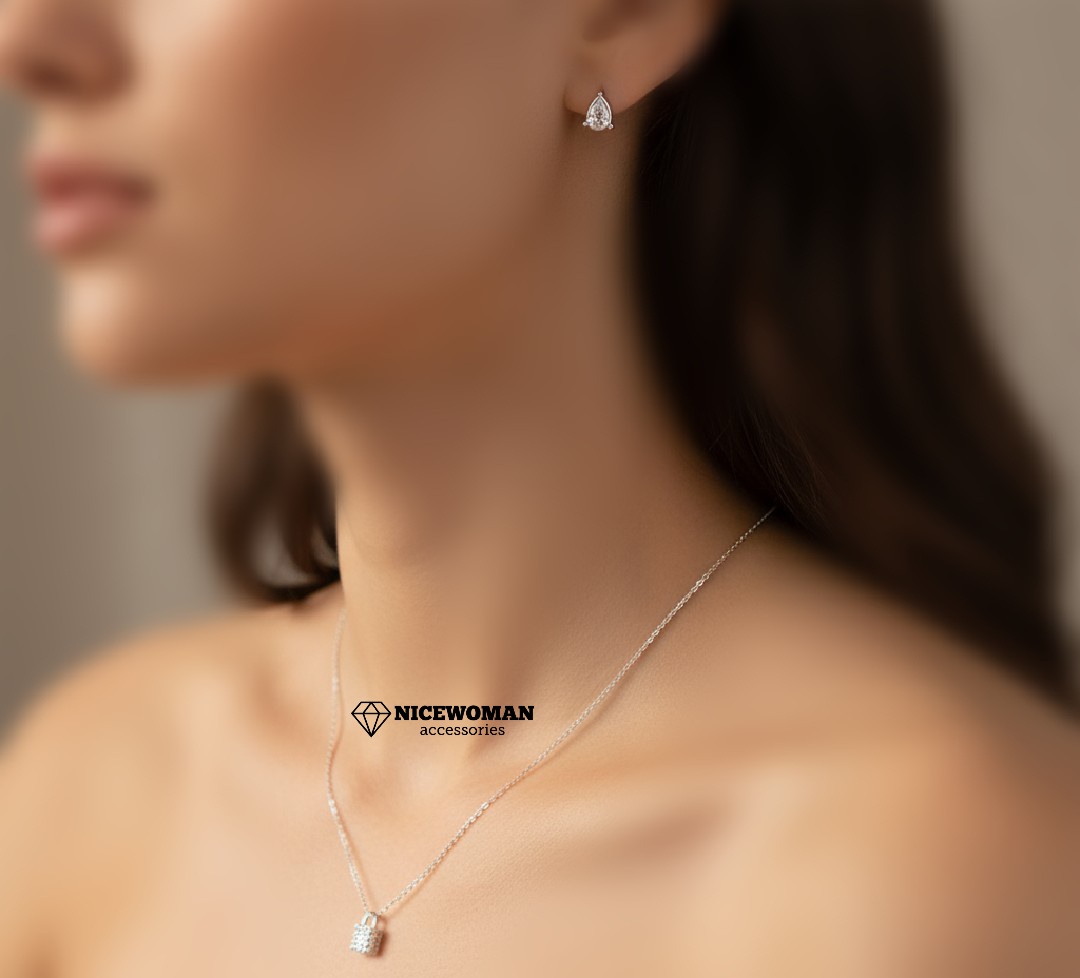 ناموجودنیمست زنانه زنجیر و پلاک و گوشواره قفل و نگین برند اروپایی ضدحساسیت