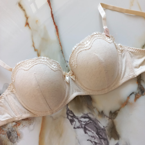 سوتین زنانه اسفنجی فنردار پلی استر نخی مخملی کرمی گلدار برند اروپایی BONDS