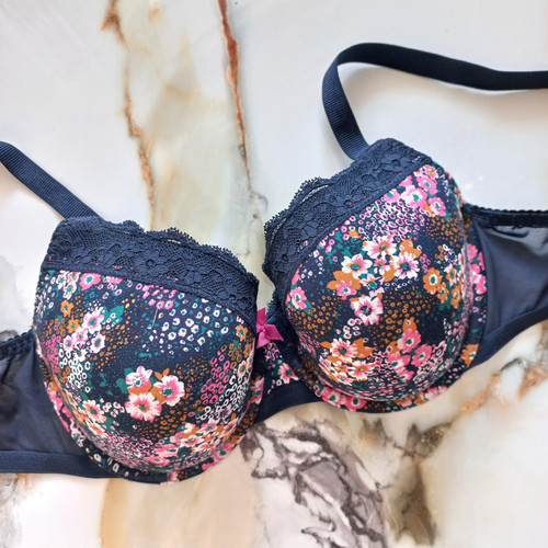 سوتین زنانه اسفنجی فنردار پلی استر سرمه ای گلدار برند اروپایی M&S