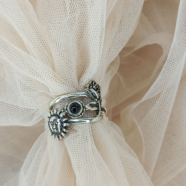 پک انگشتر نقره ای سیاه قلم گل و خورشید و سنگ مشکی برند اروپایی ضدحساسیت