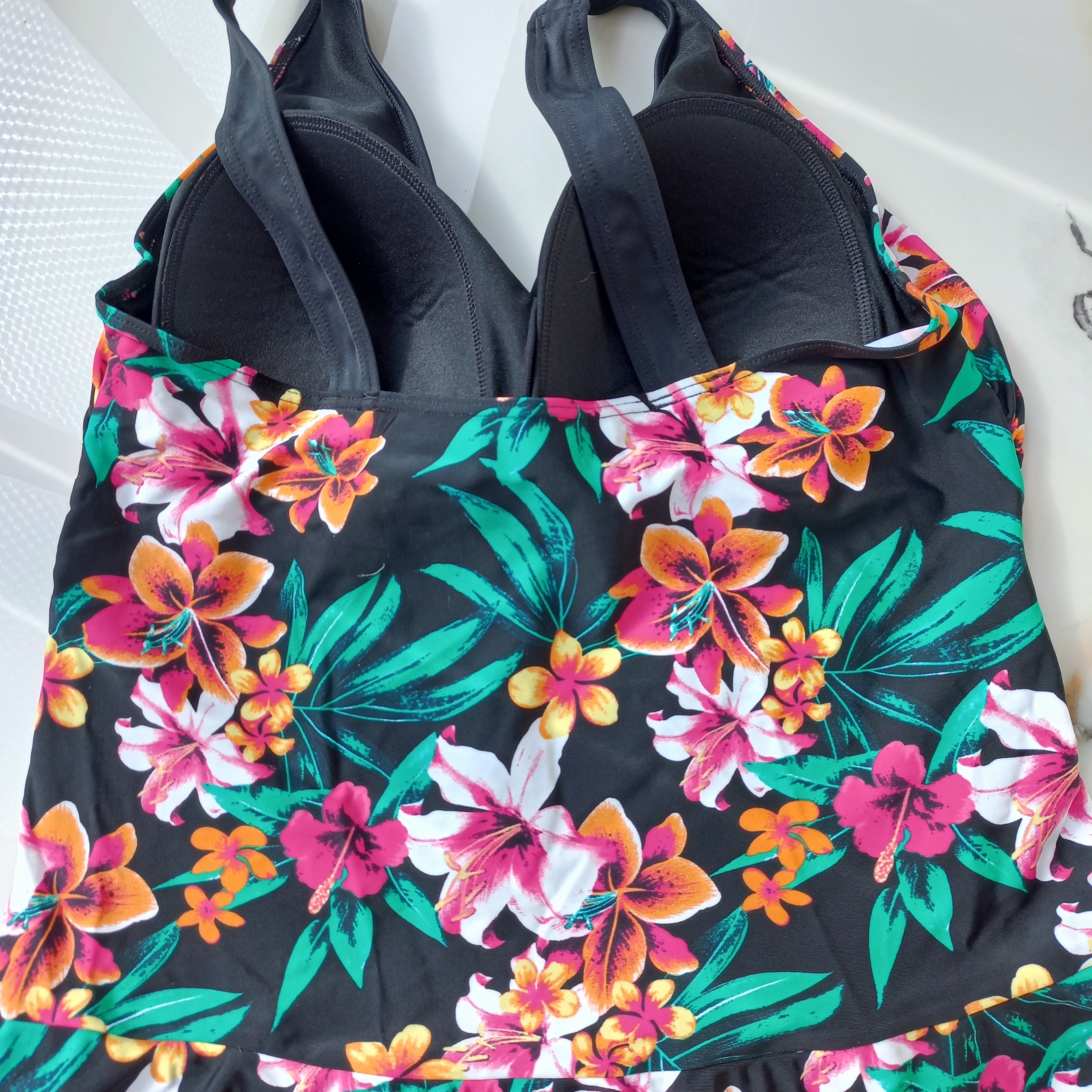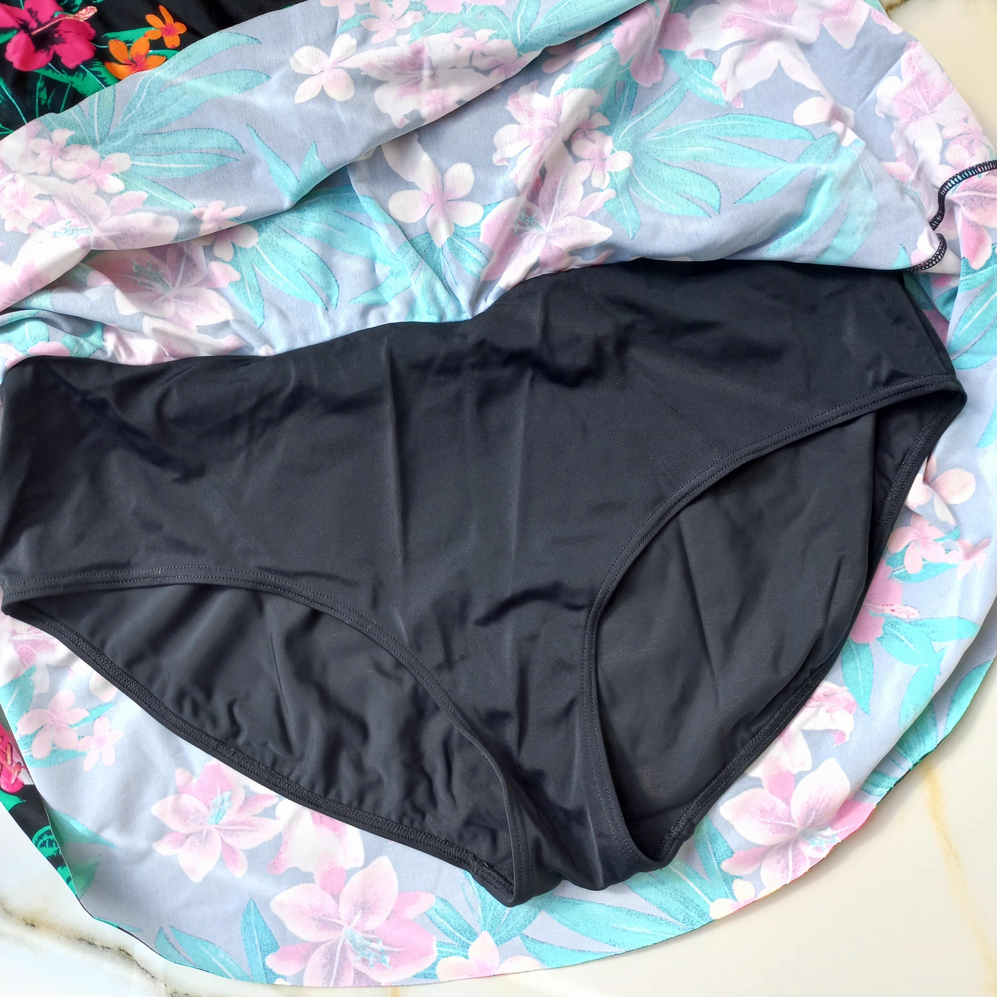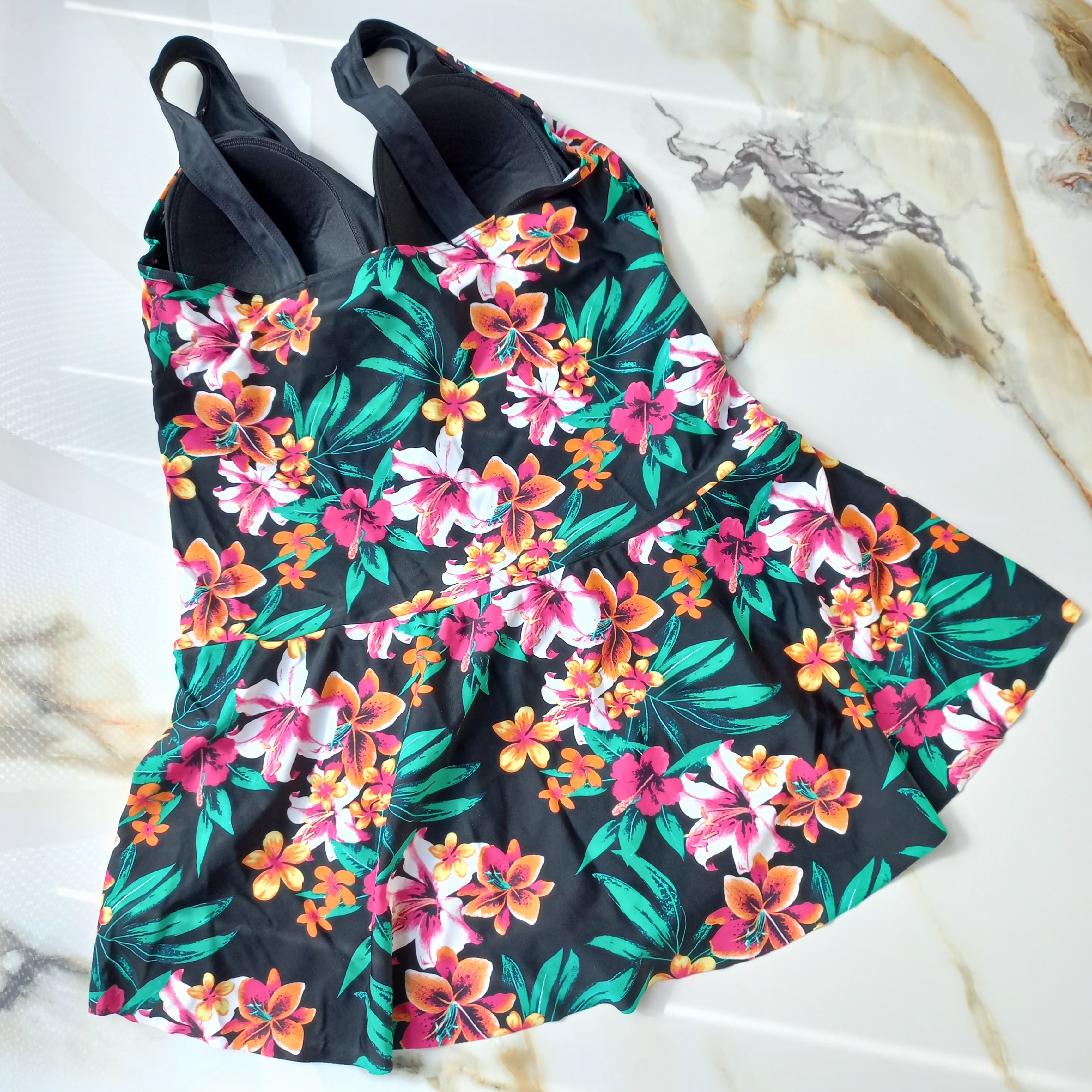 مایو زنانه دامن شورتکی کاپ دار بدون فنر مشکی طرح گل برند اروپایی تی یو ضد کلر