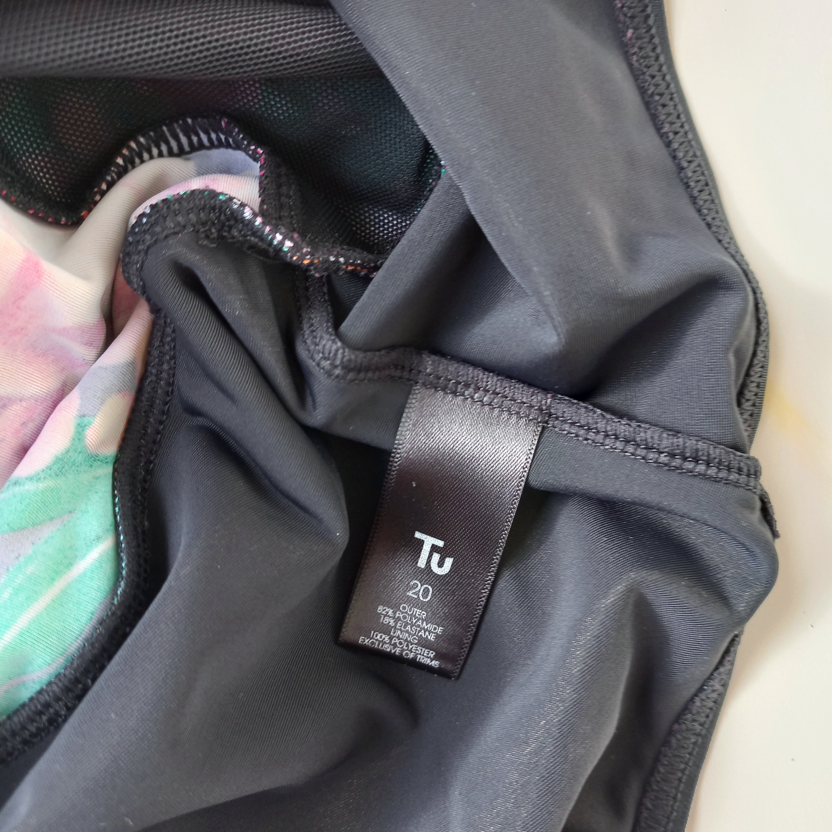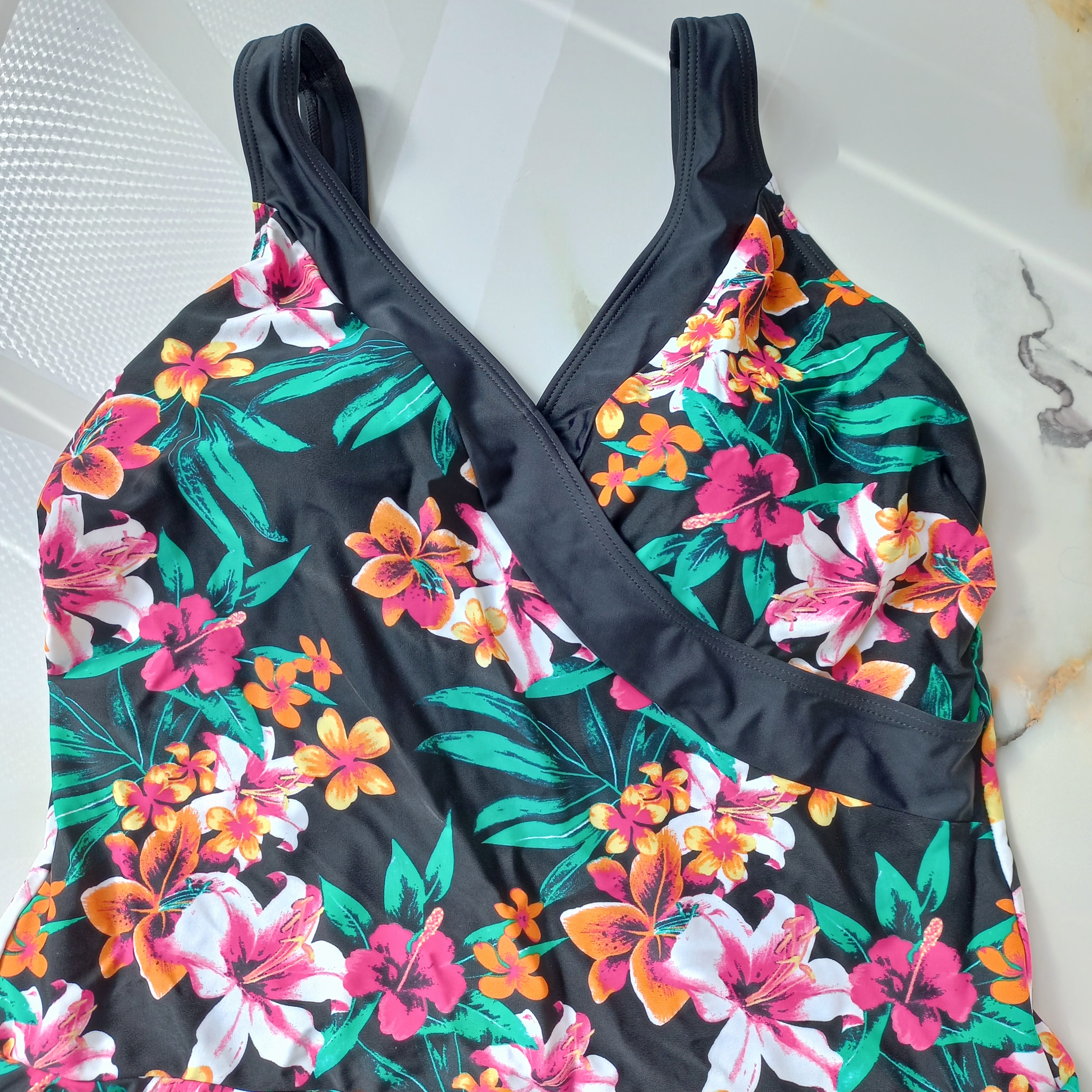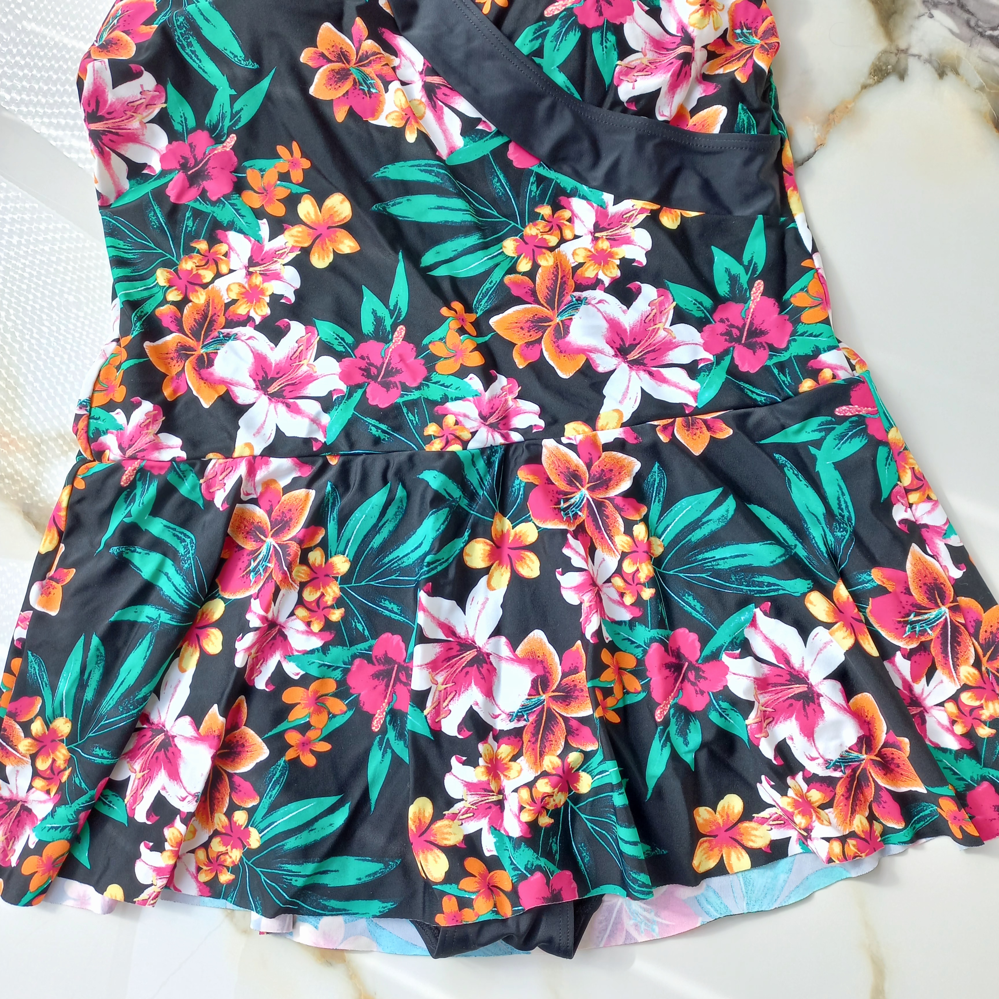 مایو زنانه دامن شورتکی کاپ دار بدون فنر مشکی طرح گل برند اروپایی تی یو ضد کلر