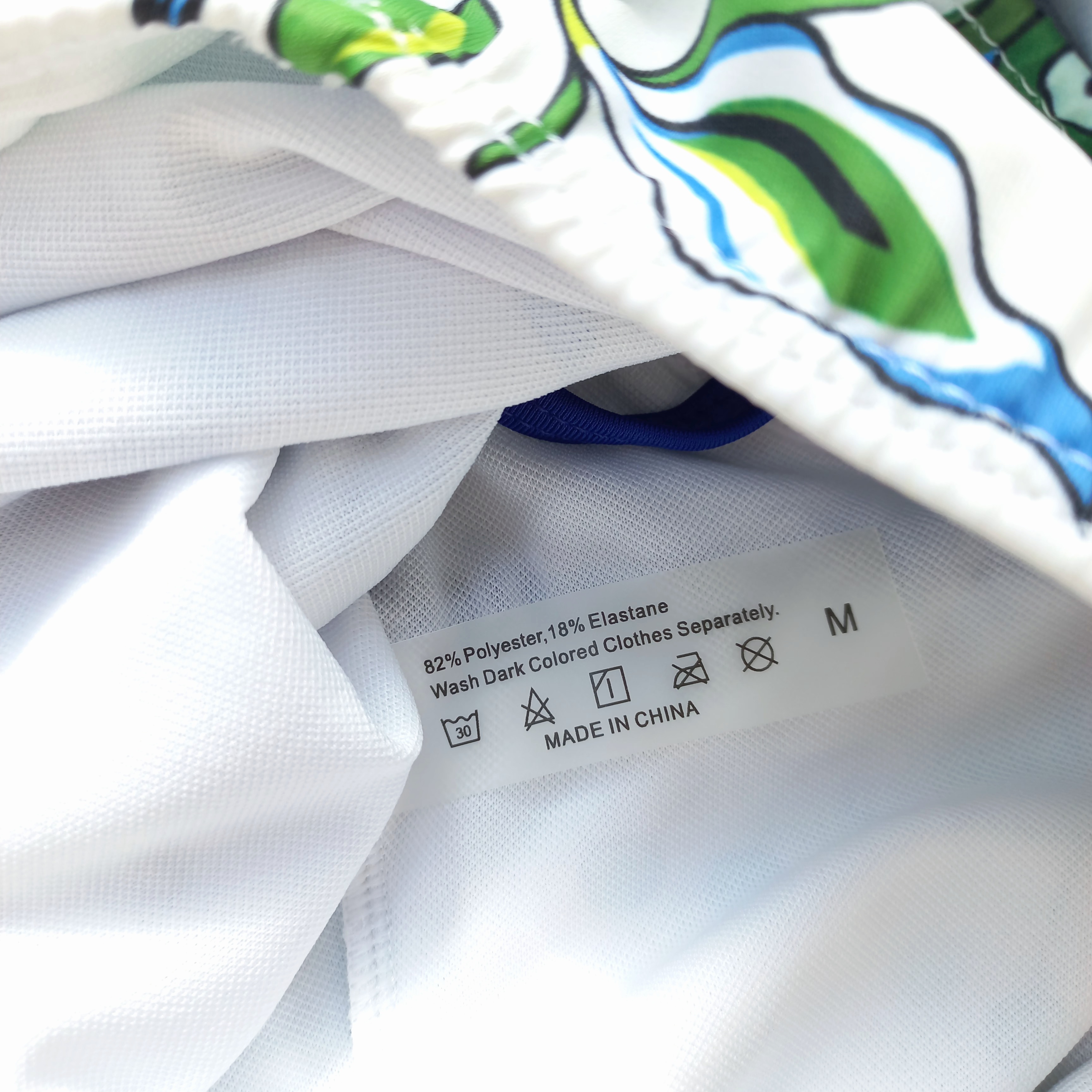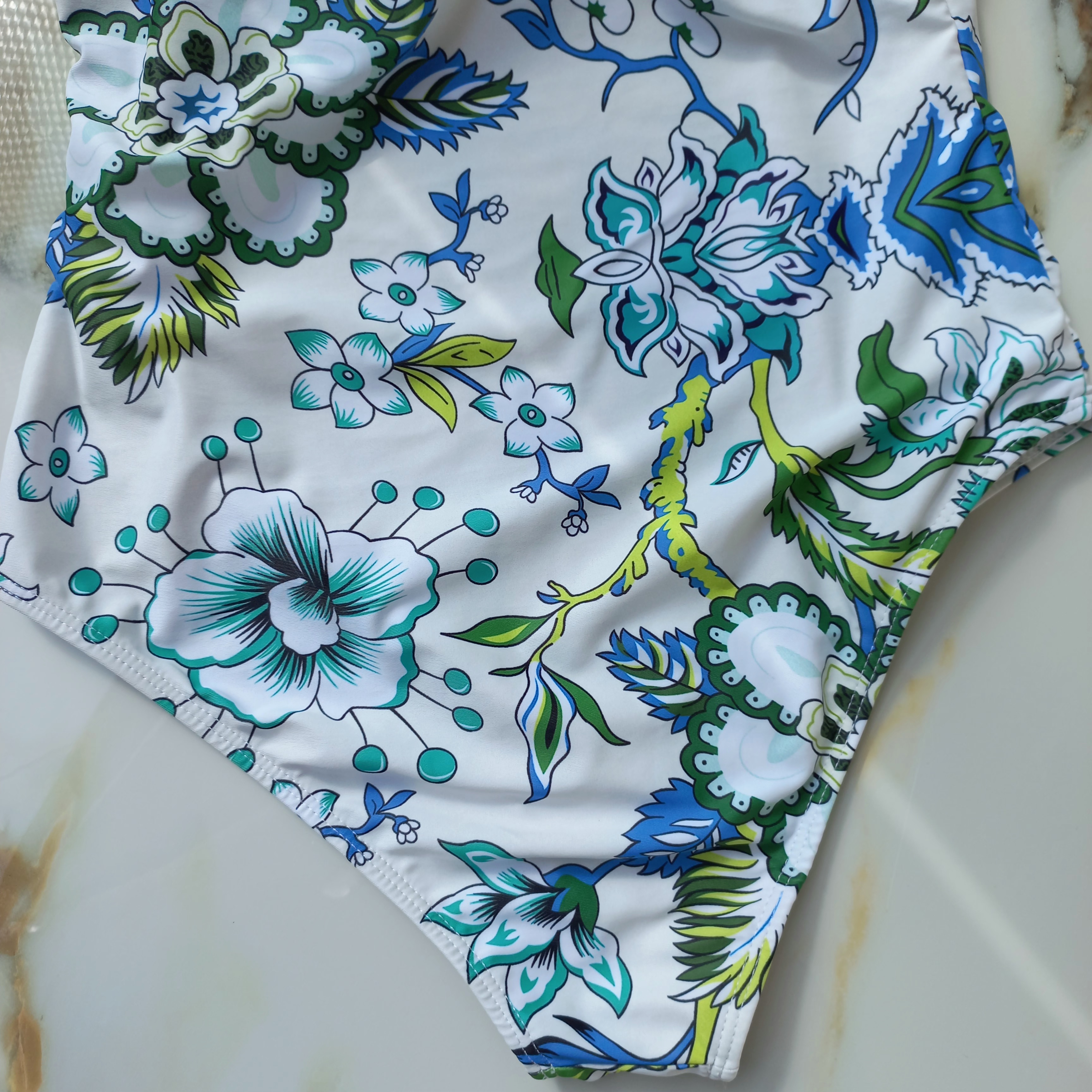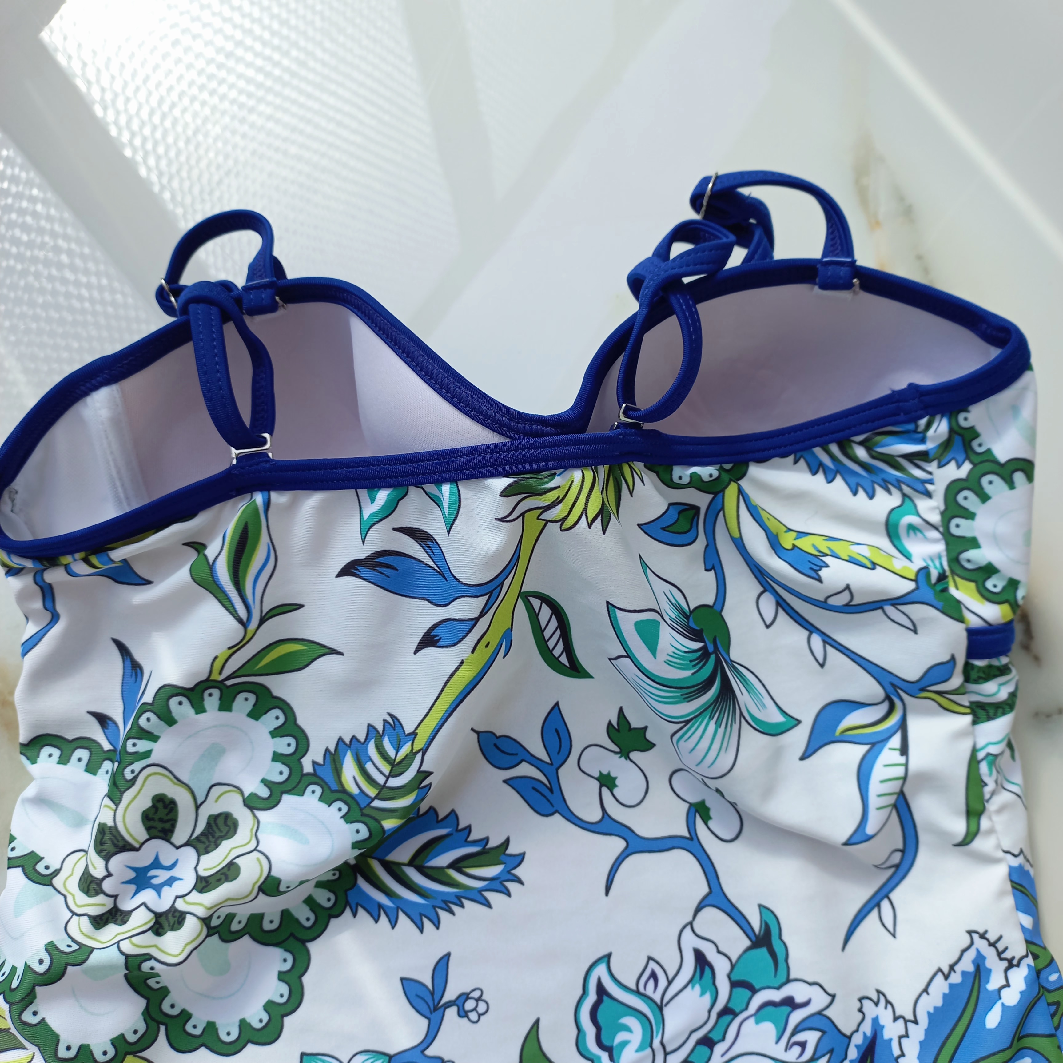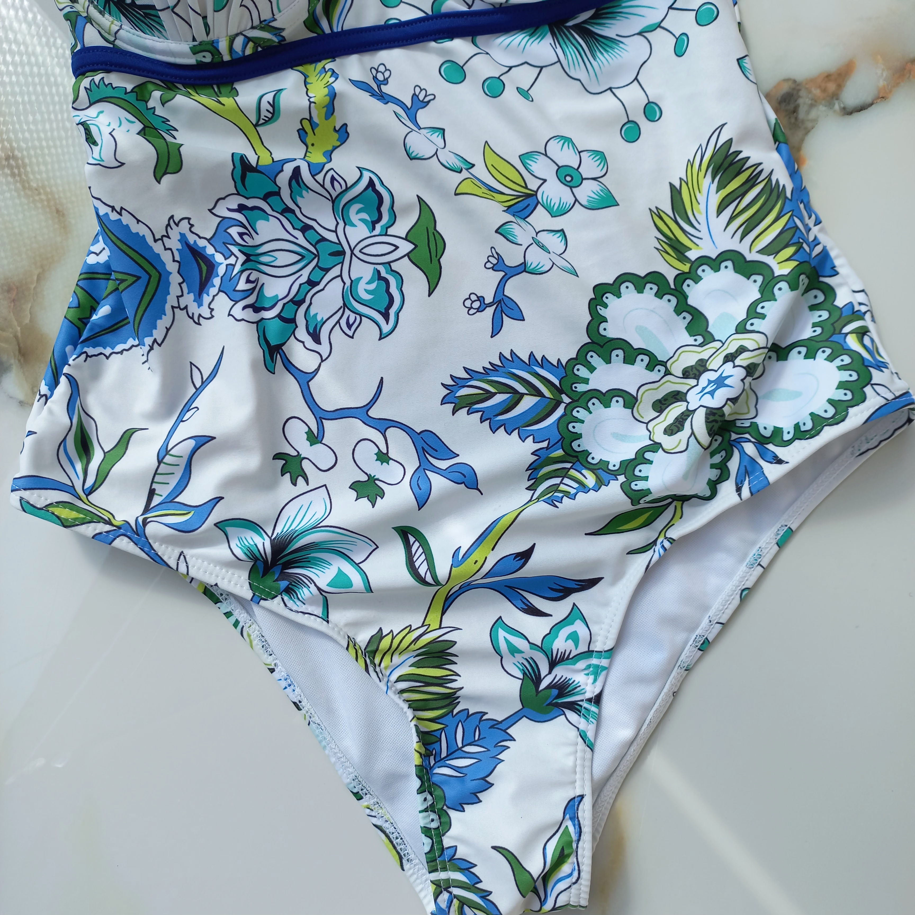 مایو زنانه کاپ دار فنردار سفید طرح سبز آبی برند اروپایی ضد کلر