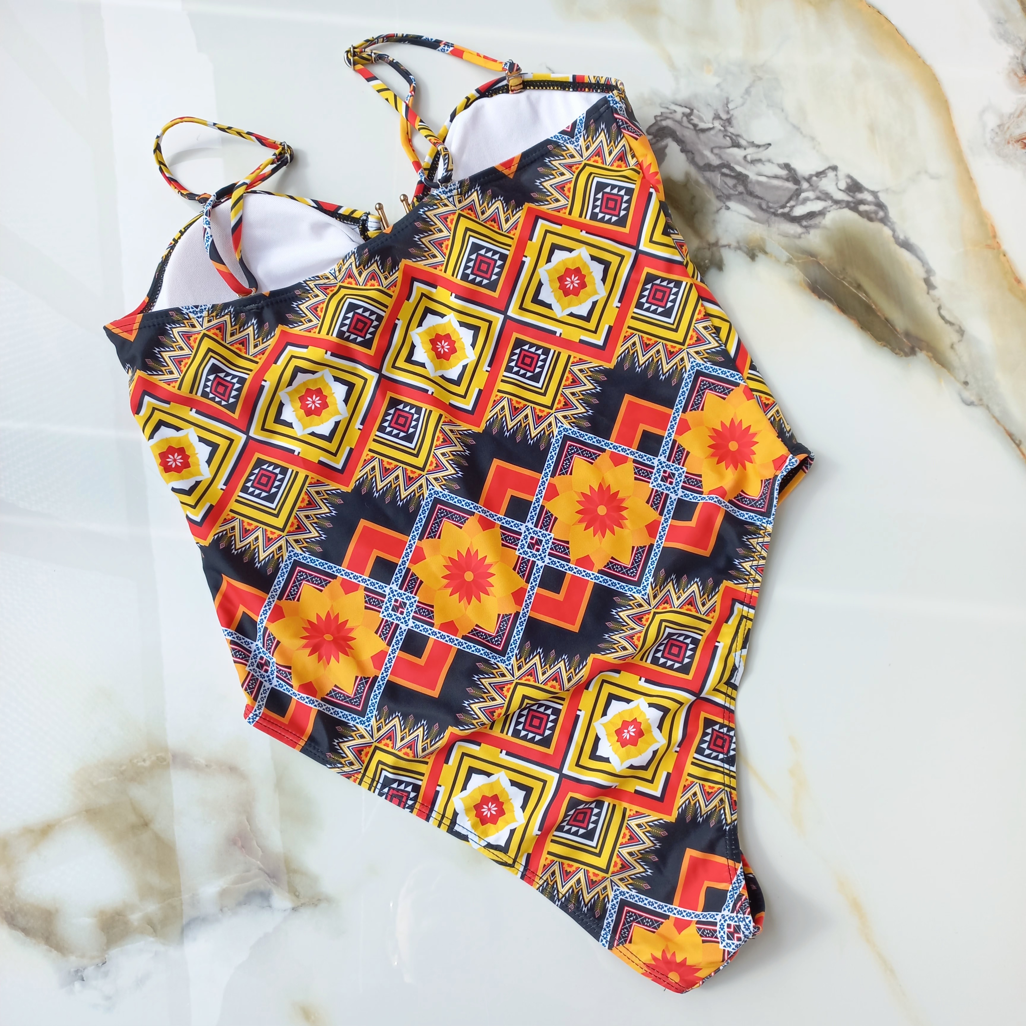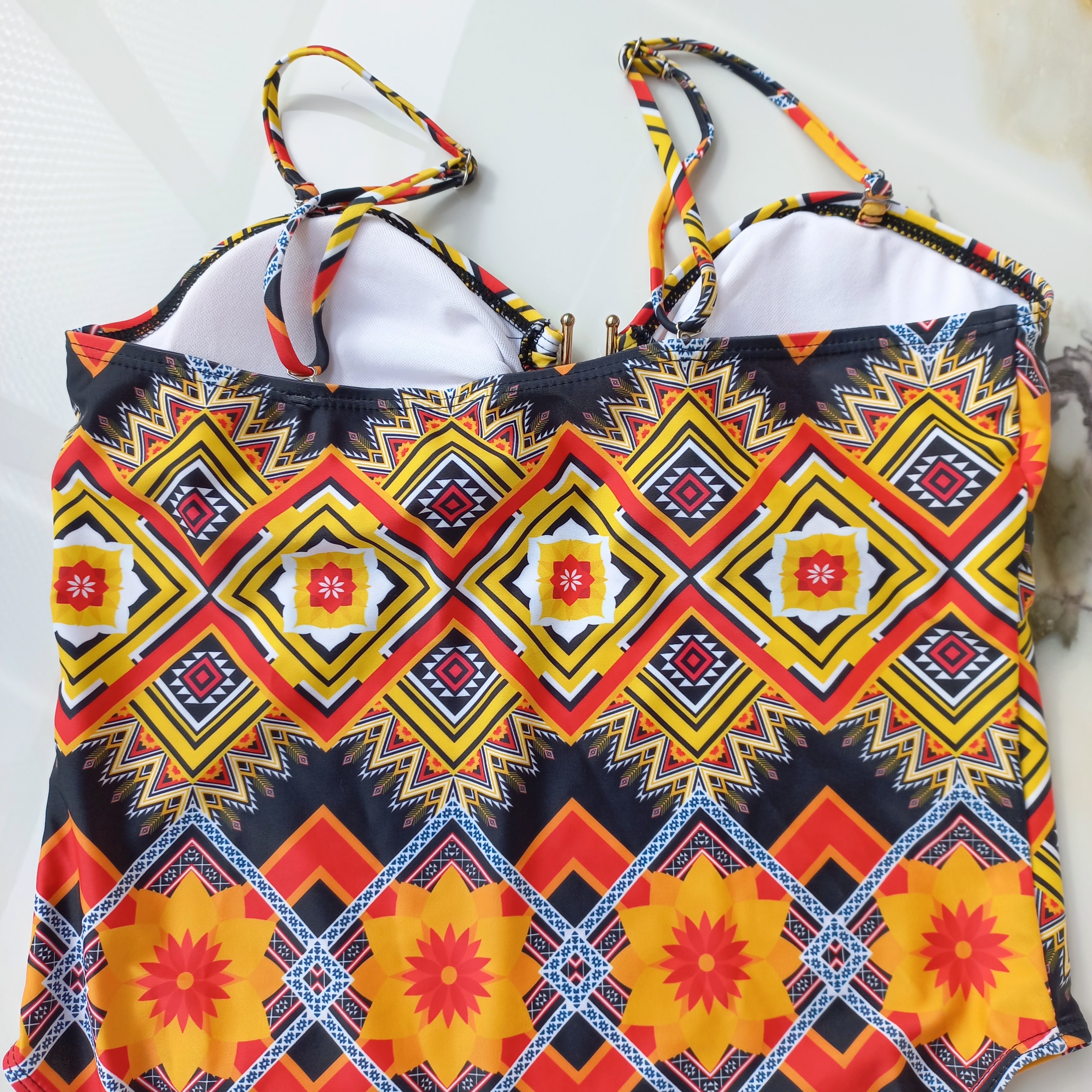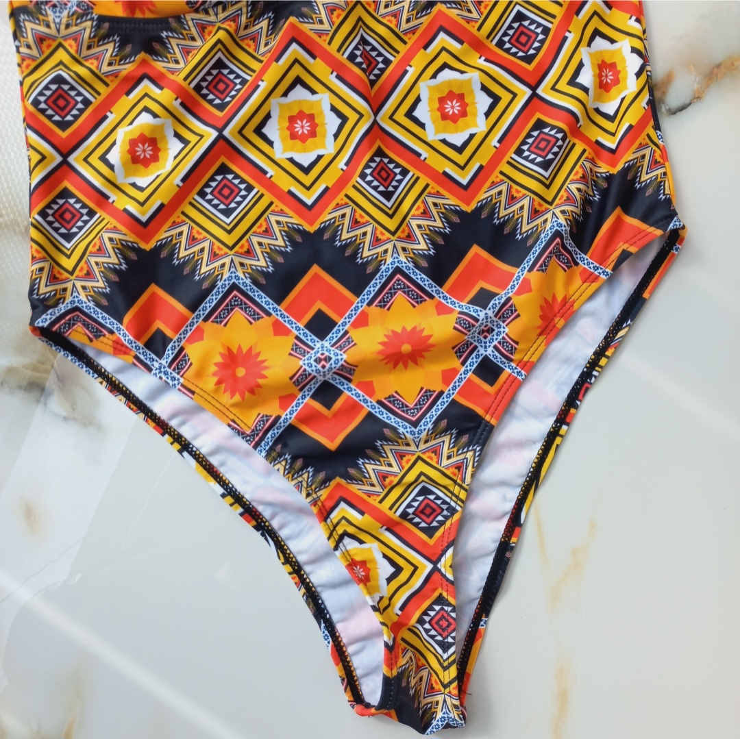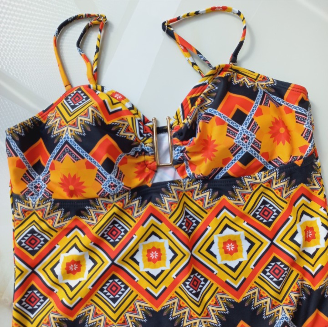مایو زنانه پد دار بدون فنر مشکی نارنجی طرح دار برند اروپایی ضد کلر