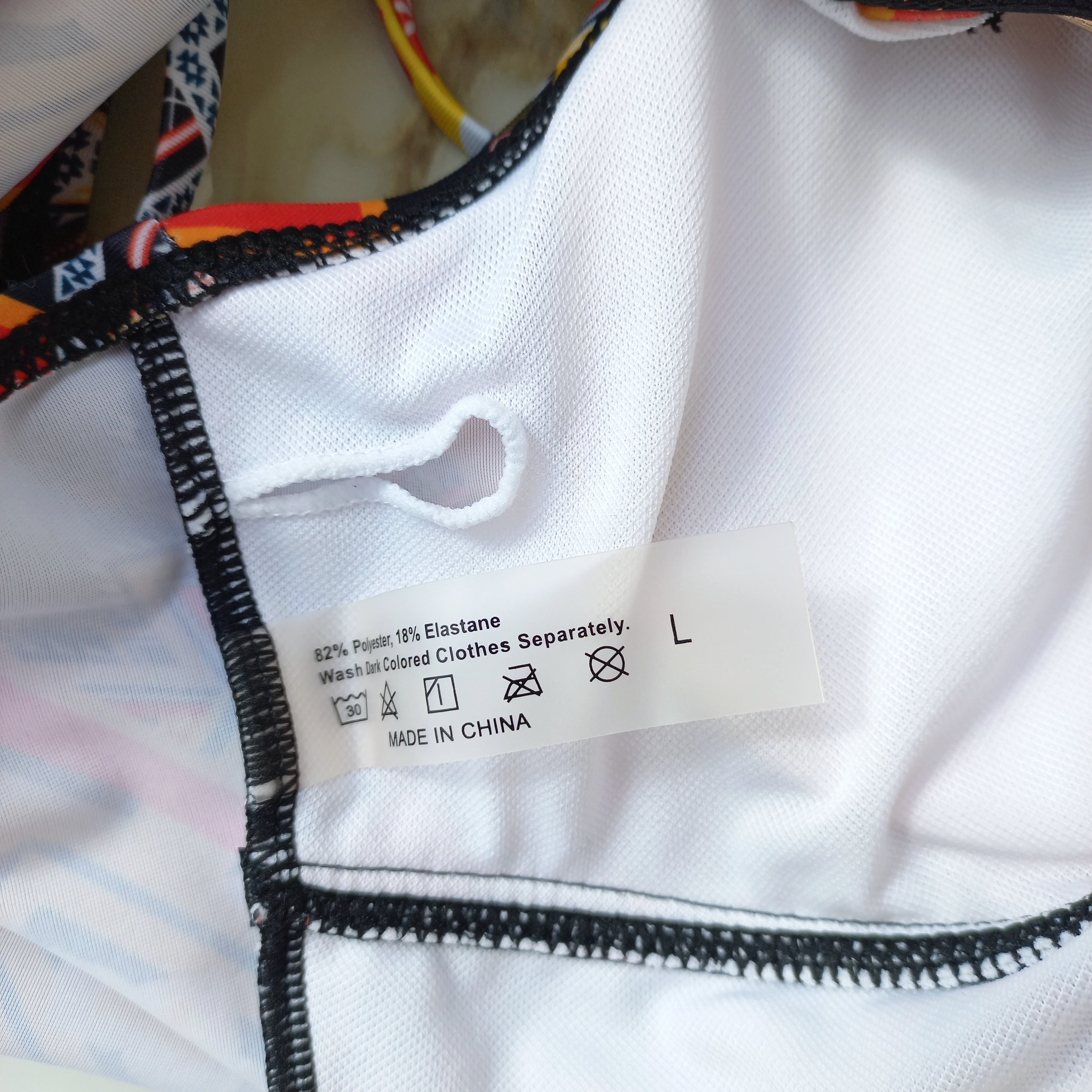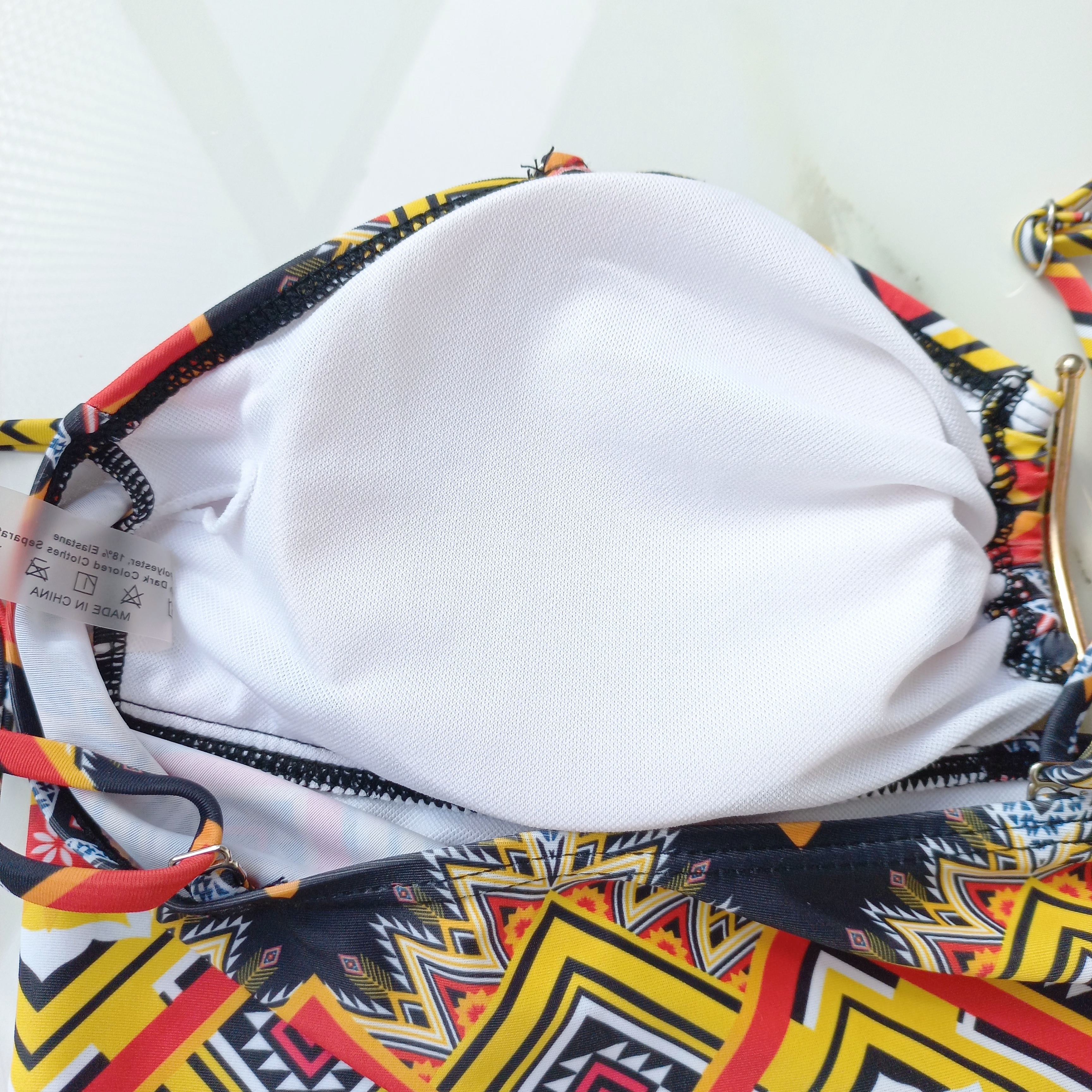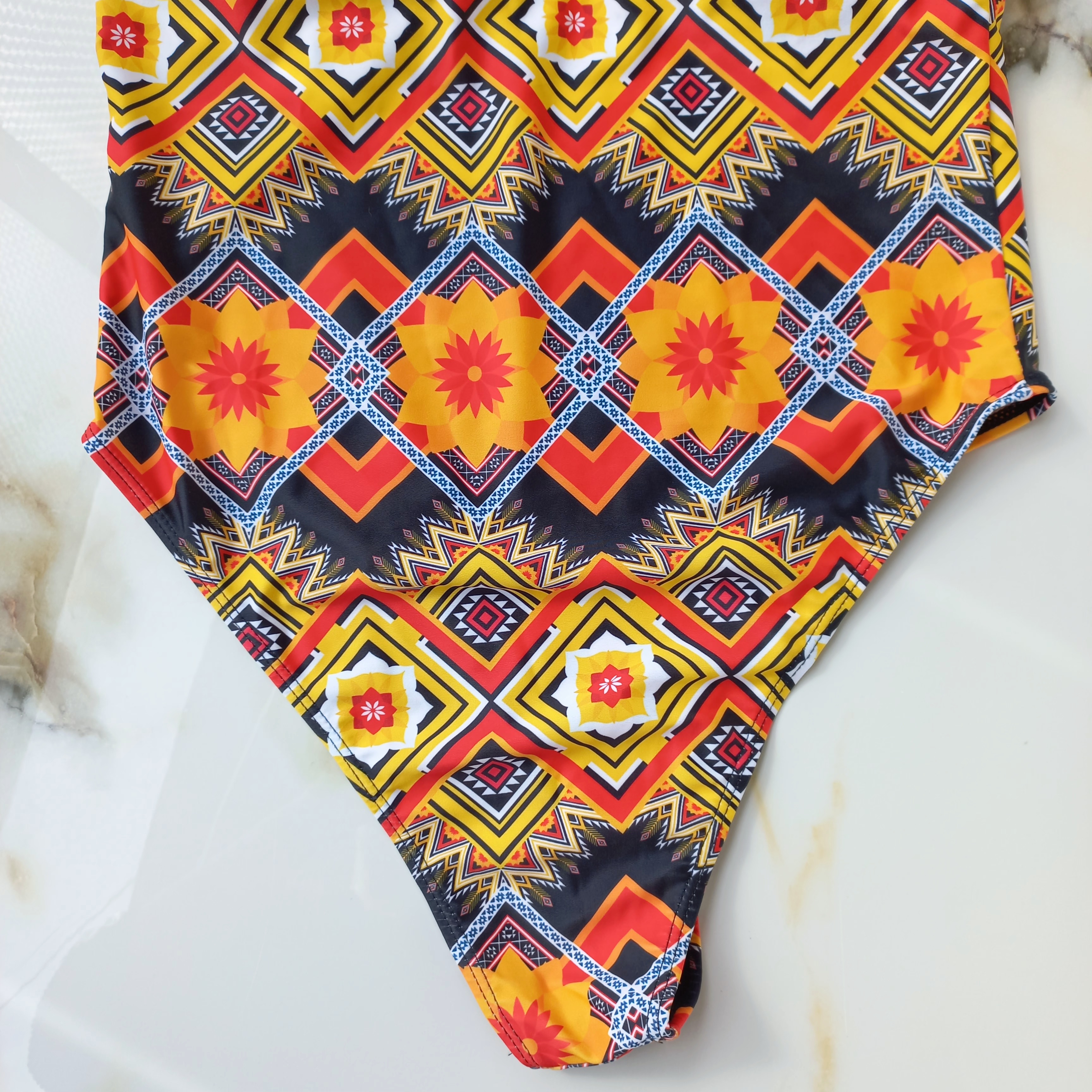 مایو زنانه پد دار بدون فنر مشکی نارنجی طرح دار برند اروپایی ضد کلر