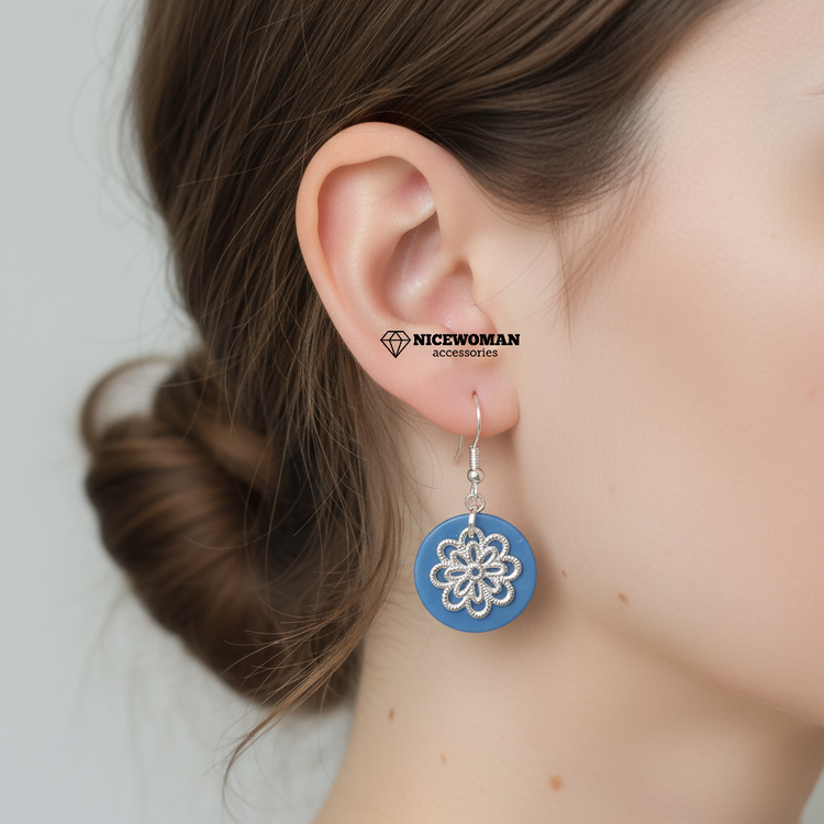 گوشواره زنانه آویز گل آبی نقره ای برند اروپایی Iam ضدحساسیت