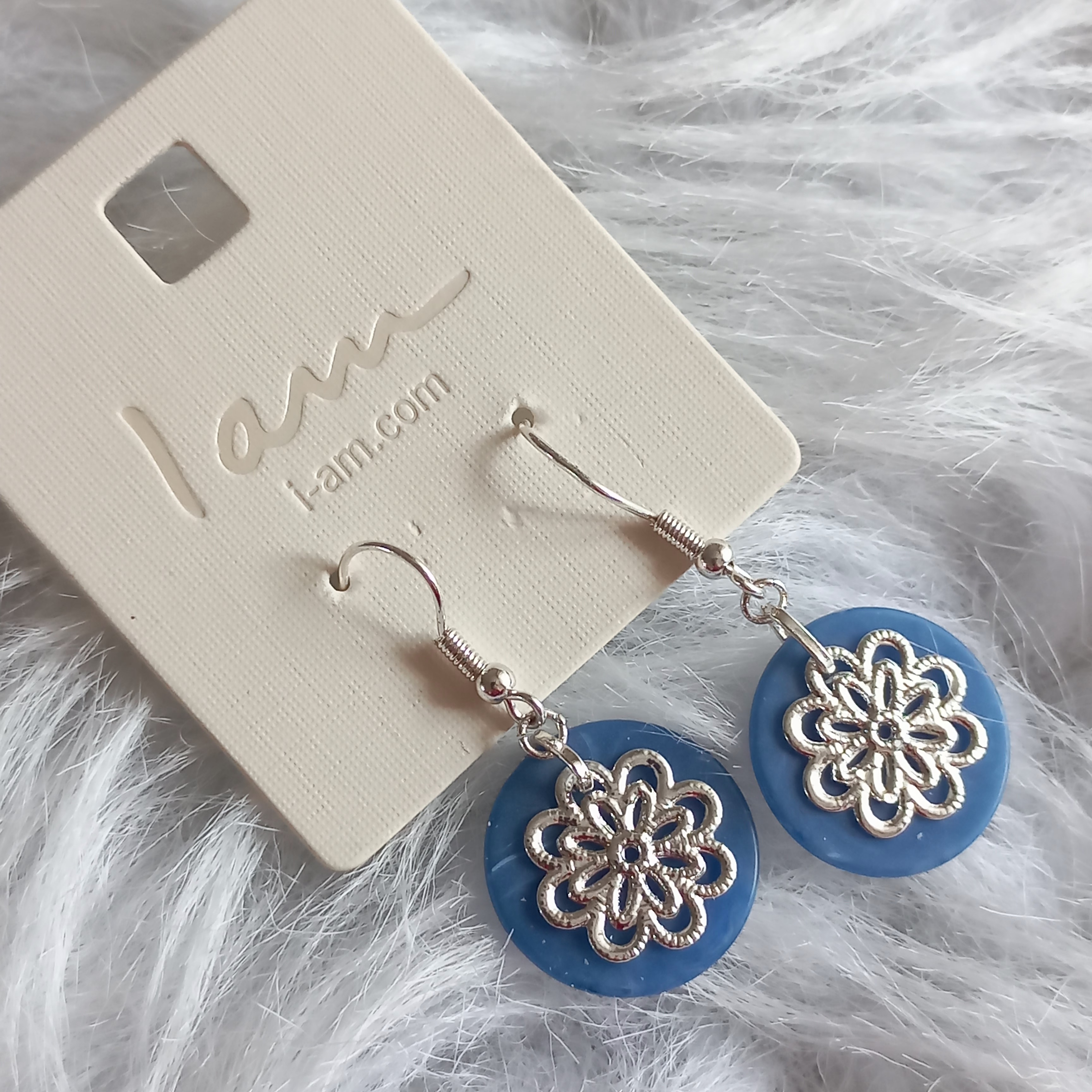 گوشواره زنانه آویز گل آبی نقره ای برند اروپایی Iam ضدحساسیت