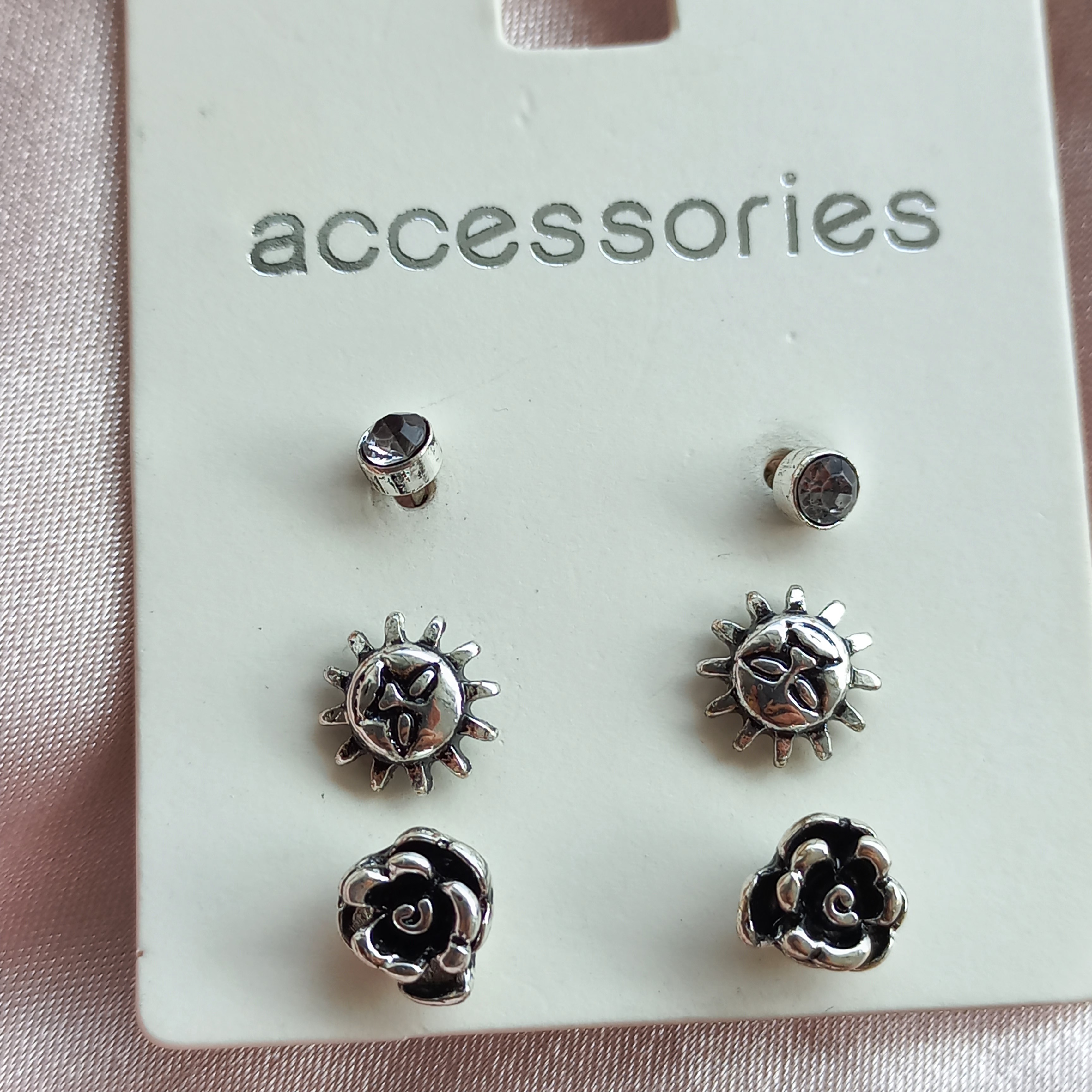 پک گوشواره زنانه میخی سیاه قلم گل و خورشید و نگین نقره ای برند اروپایی accessories ضدحساسیت