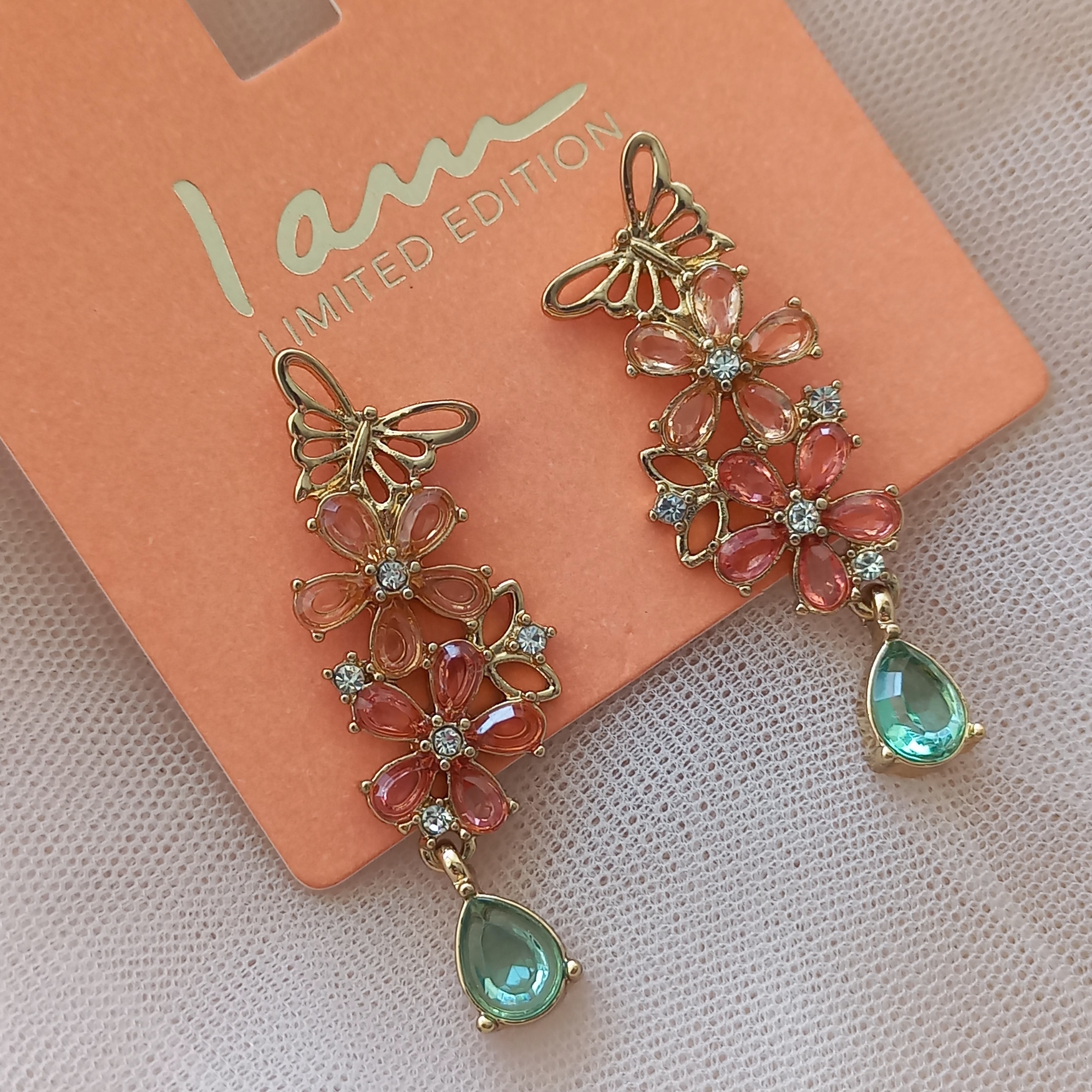 گوشواره زنانه میخی آویز گل پروانه نگیندار طلایی برند اروپایی Iam ضدحساسیت