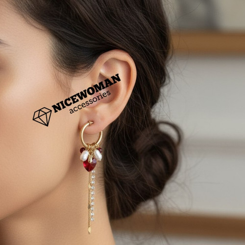 گوشواره زنانه حلقه ای طلایی آویزدار سنگ و مروارید برند اروپایی Iam ضدحساسیت