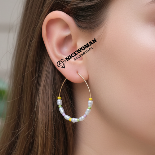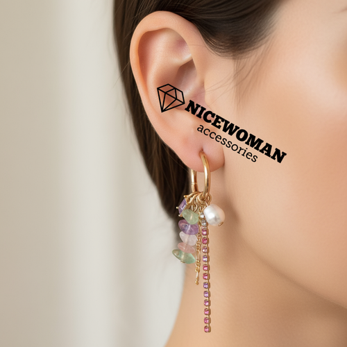 گوشواره زنانه حلقه ای طلایی آویز سنگی و مروارید برند اروپایی Iam ضدحساسیت