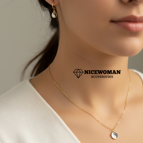 نیمست زنانه طلایی روکش طلا زنجیر و پلاک و گوشواره یینگ و یانگ برند اروپایی Iam ضدحساسیت