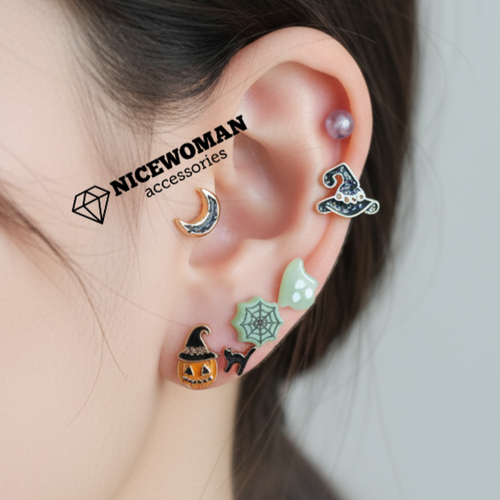پک گوشواره زنانه هالووین چهارتایی مشکی نئونی میخی برند اروپایی Iam ضدحساسیت