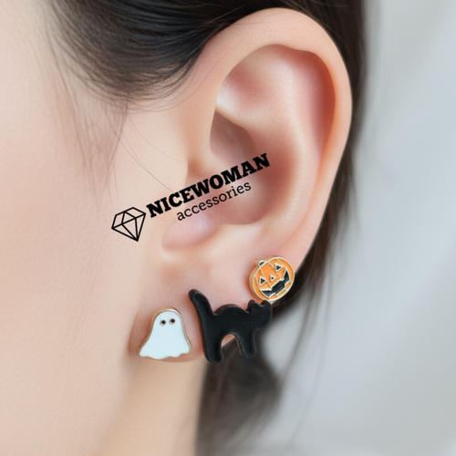 پک گوشواره زنانه میخی هالووین روح و کدو و گربه برند اروپایی Iam ضدحساسیت