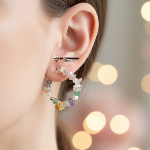 گوشواره زنانه میخی نیم حلقه سنگ رنگی و مروارید برند اروپایی Iam ضدحساسیت