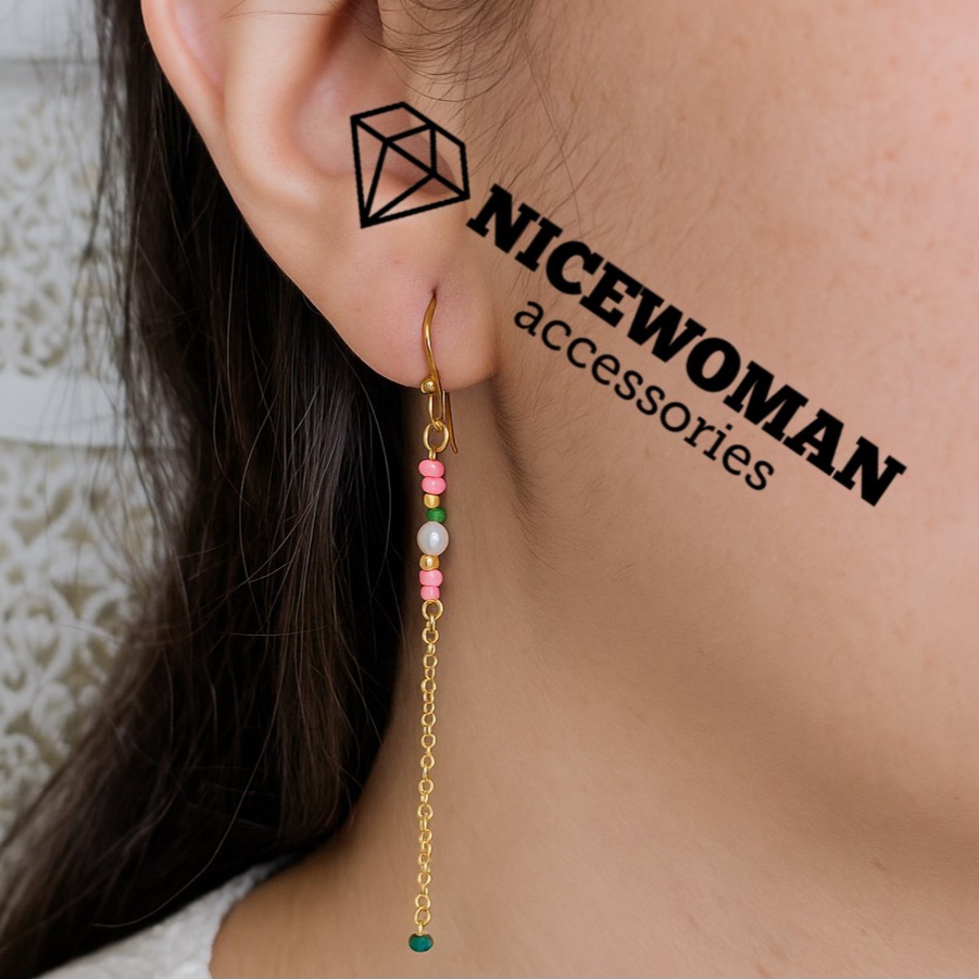 گوشواره زنانه آویز طلایی مهره رنگی و مروارید برند اروپایی ضدحساسیت