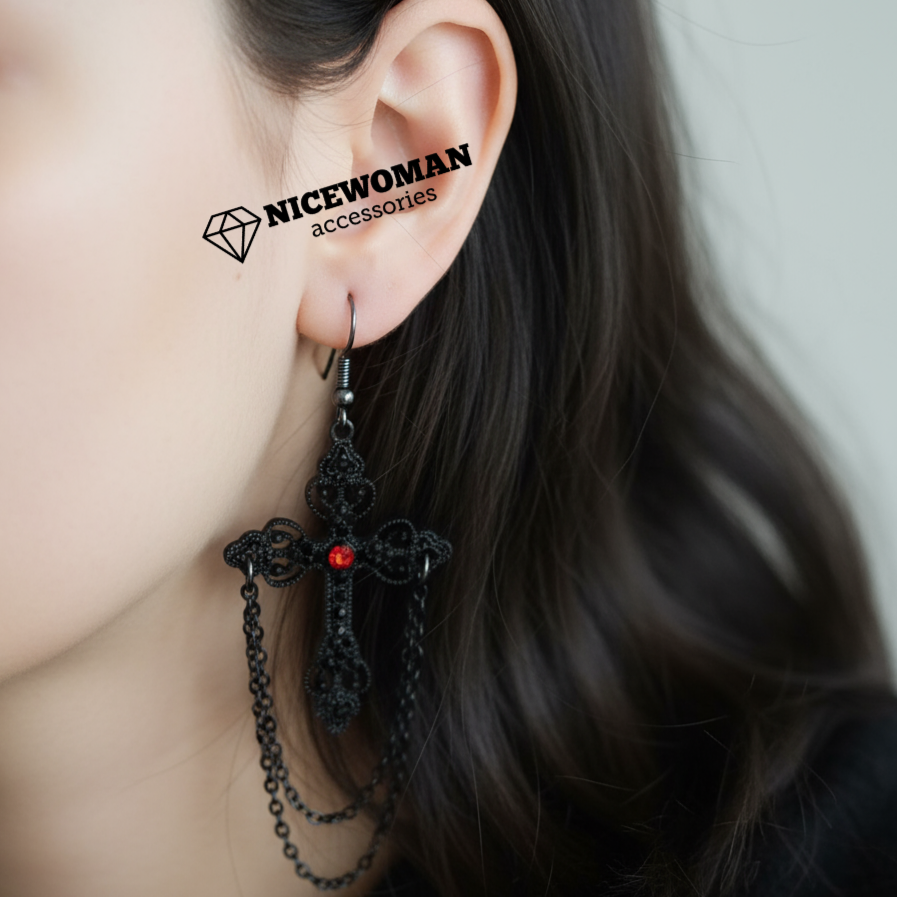 گوشواره زنانه آویز مشکی هالووین طرح صلیب نگین دار برند اروپایی Iam ضدحساسیت