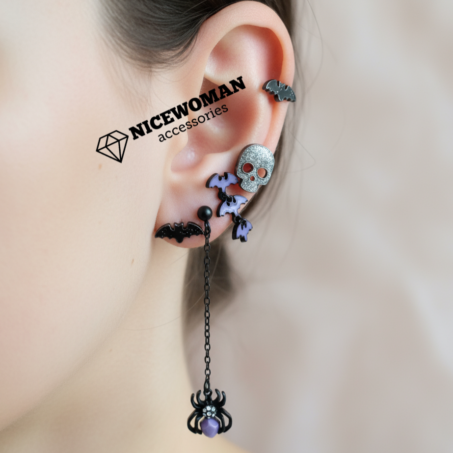 پک گوشواره زنانه هالووین چهارتایی مشکی نئونی میخی برند اروپایی Iam ضدحساسیت