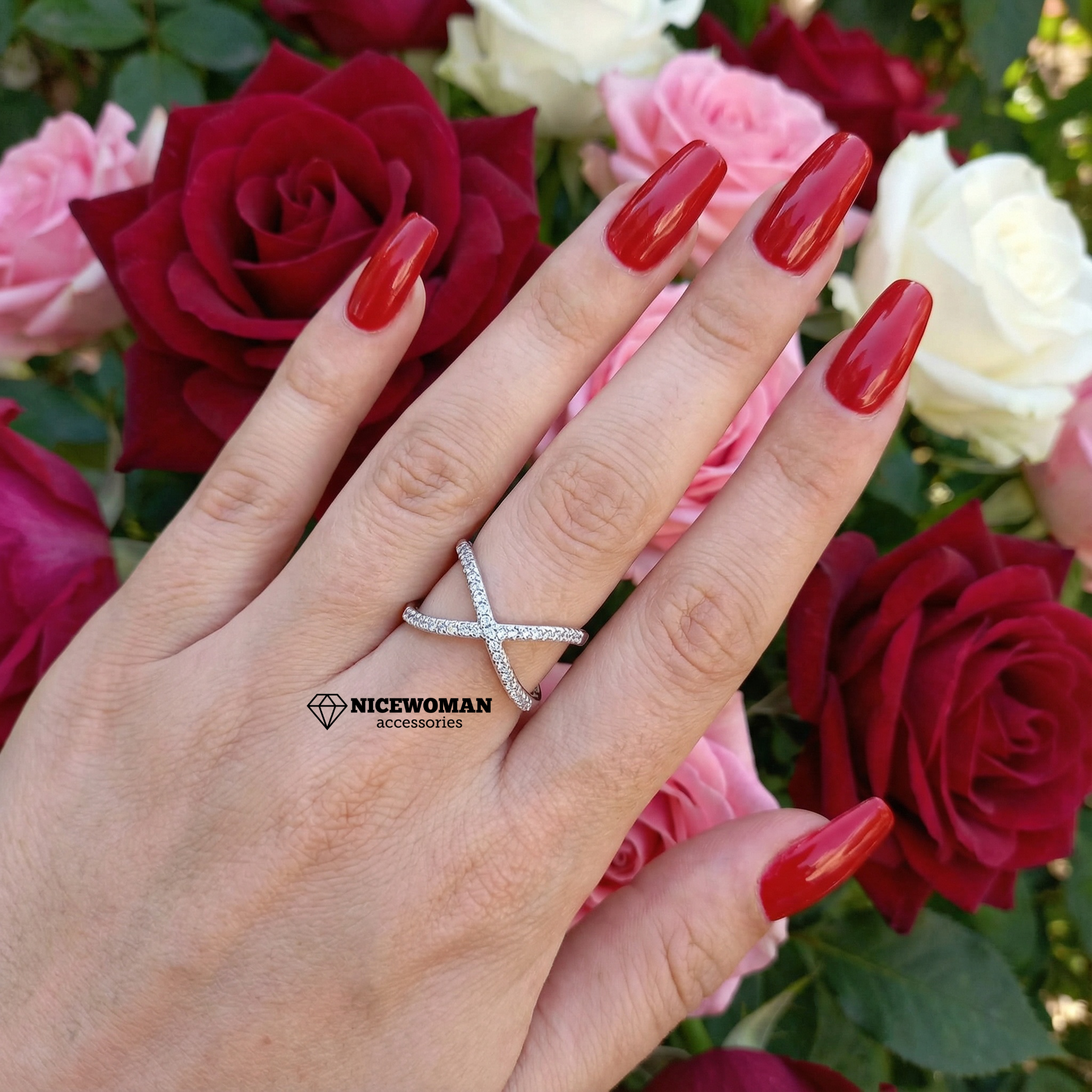 انگشتر زنانه نقره ای ضربدری نگین دار برند اروپایی ضدحساسیت